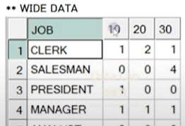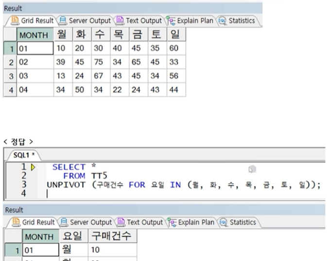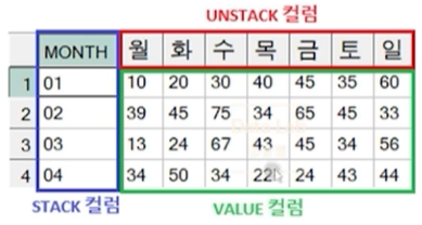 - PIVOT절에서 선언한 VALUE, UNSTACK컬럼 제외, FROM절에 선언된 모든 컬럼은 STACK컬럼이 됨