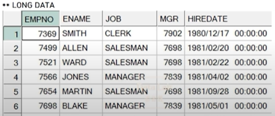 - 하나의 속성이 하나의 컬럼으로 정의되어 값들이 여러 행으로 쌓이는 구조