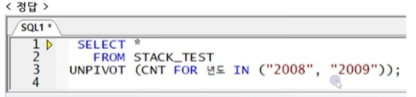 UNPIVOT (VALUE컬럼명 FOR STACK컬럼명 IN (필드값 목록));